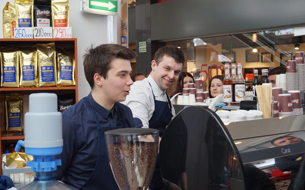 От нашей компании был представлен стенд бренда «Barista». Это сравнительно молодой бренд белорусского свежеобжаренного кофе, с которым знакомили посетителей наши сотрудники: Вадим Манкевич, руководитель Тренерского Центра; Сергей Грязнов – бариста-тренер и Алеся Бондарь, наш топ-менеджер из Бреста. Все они на славу постарались для того, чтобы все посетители смогли насладиться кофе fresh-обжарки.