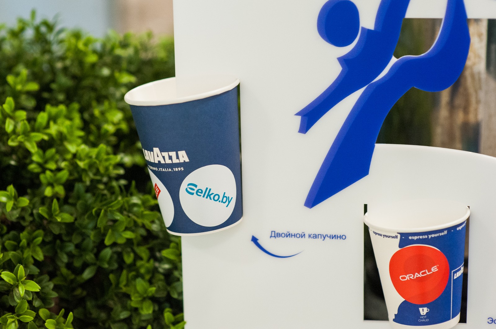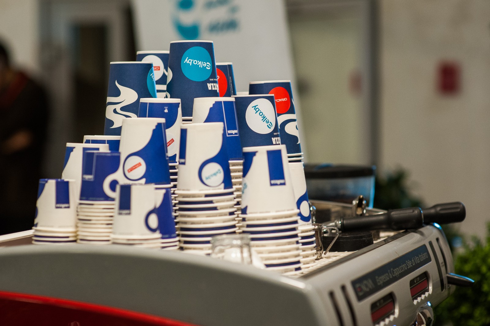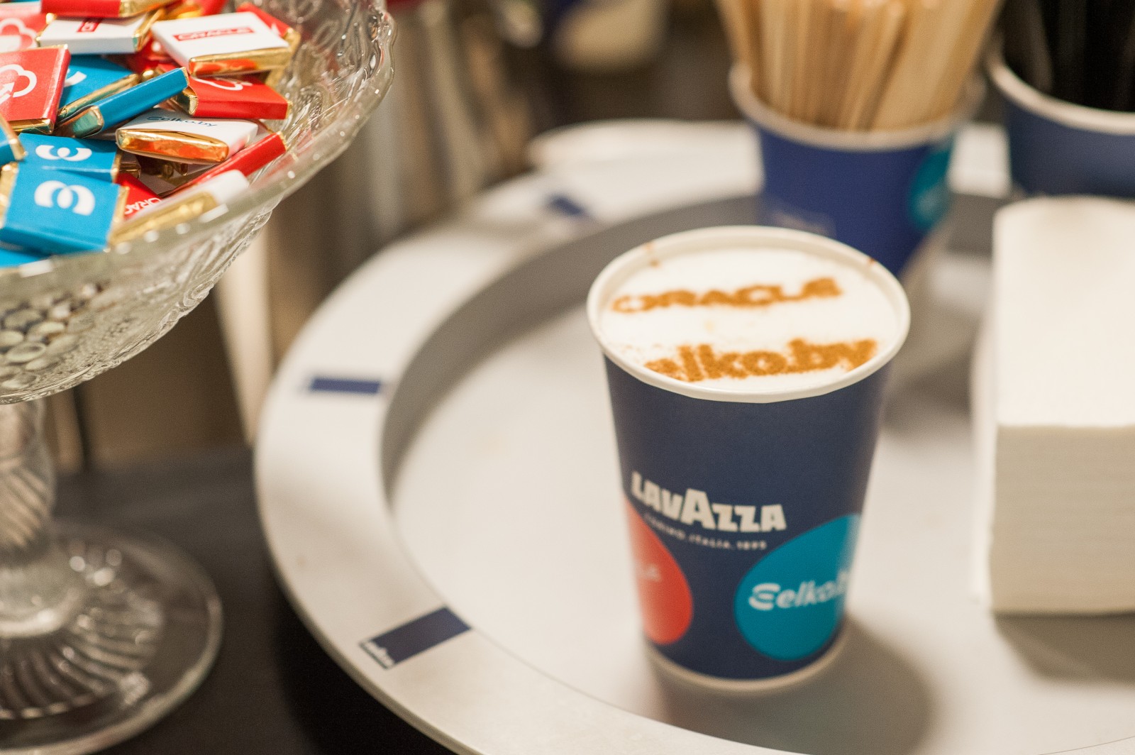 Небольшое приятное напоминание о цели встречи присутствовало на каждой чашке кофе – яркая оранжевая наклеечка с логотипом «Elcore» и «Oracle» приятно выделялись на фоне синего стаканчика «Lavazza».